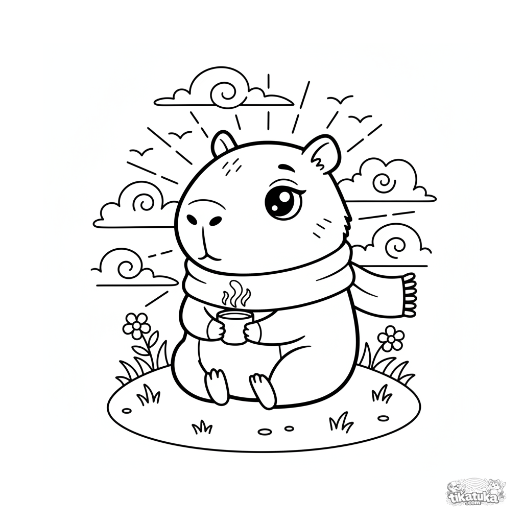 Página para colorir para crianças 4-6: uma fofa capivara chibi de cachecol sentada num montinho, olhando o pôr do sol com uma xícara. Cena simples e fofa.