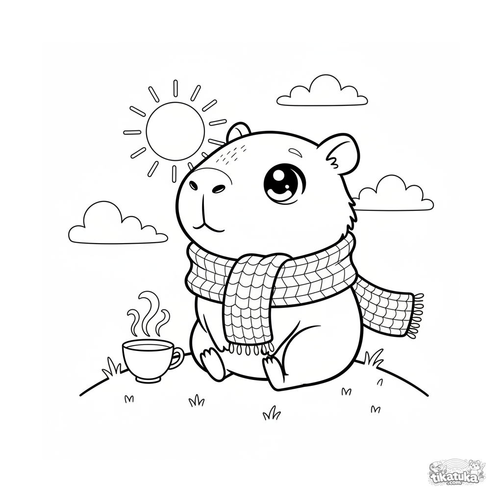 Página para colorir estilo chibi: uma capivara fofa com cachecol observa o pôr do sol sonhadora. Cena simples e doce para 4-6 anos.