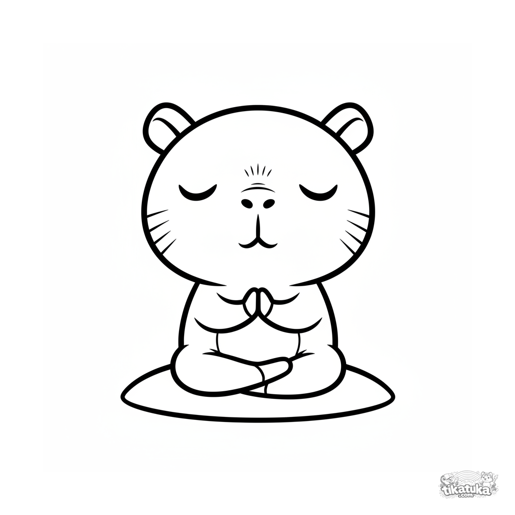 Página simples para colorir para crianças de 2-3 anos: uma capivara chibi meditando ao pôr do sol. Formas grandes, contornos grossos.