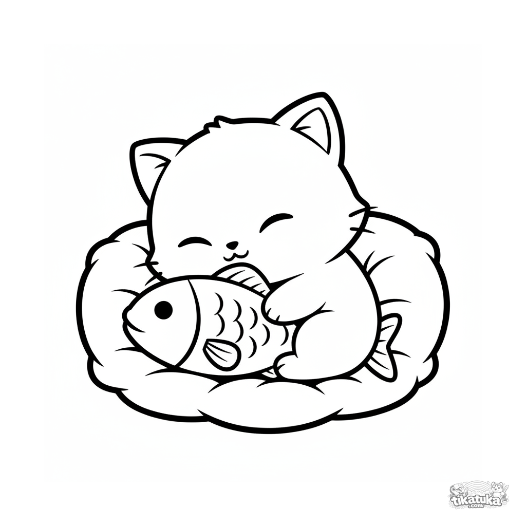 Página para colorir para crianças pequenas: um gatinho chibi fofo no estilo anime dorme profundamente em uma almofada, abraçando um brinquedo de pelúcia em forma de peixe. Cabeça enorme, formas simples, perfeito para 2-3 anos.
