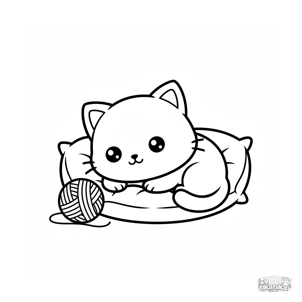 Página para colorir estilo chibi para crianças pequenas: um gato com cabeça grande dorme profundamente em um travesseiro, um novelo de lã ao lado. Formas muito simples e fofas.