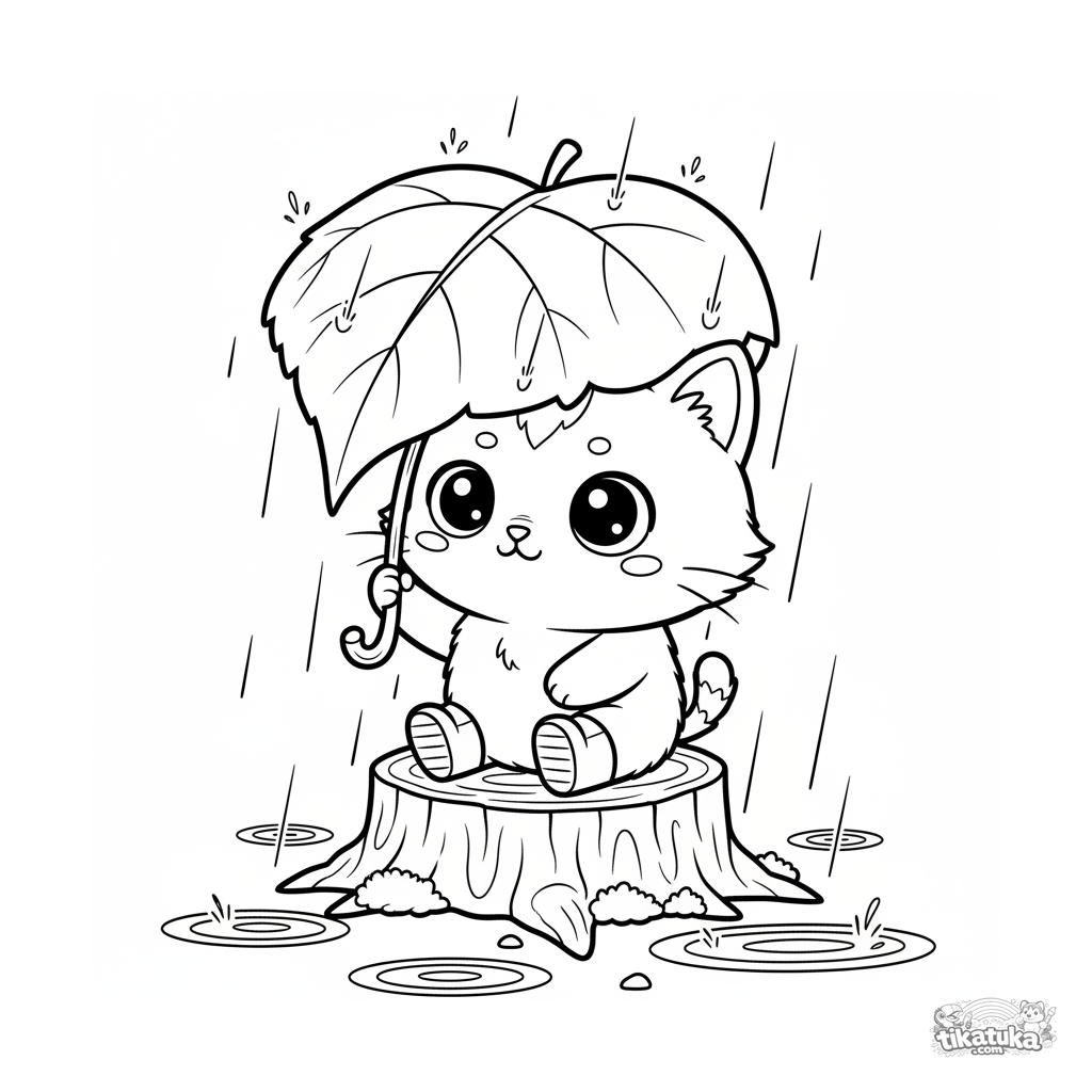 Página para colorir para crianças de 4-6 anos estilo chibi: um gatinho fofo com botas se esconde da chuva sob uma grande folha de bordo. Cena divertida e simples.