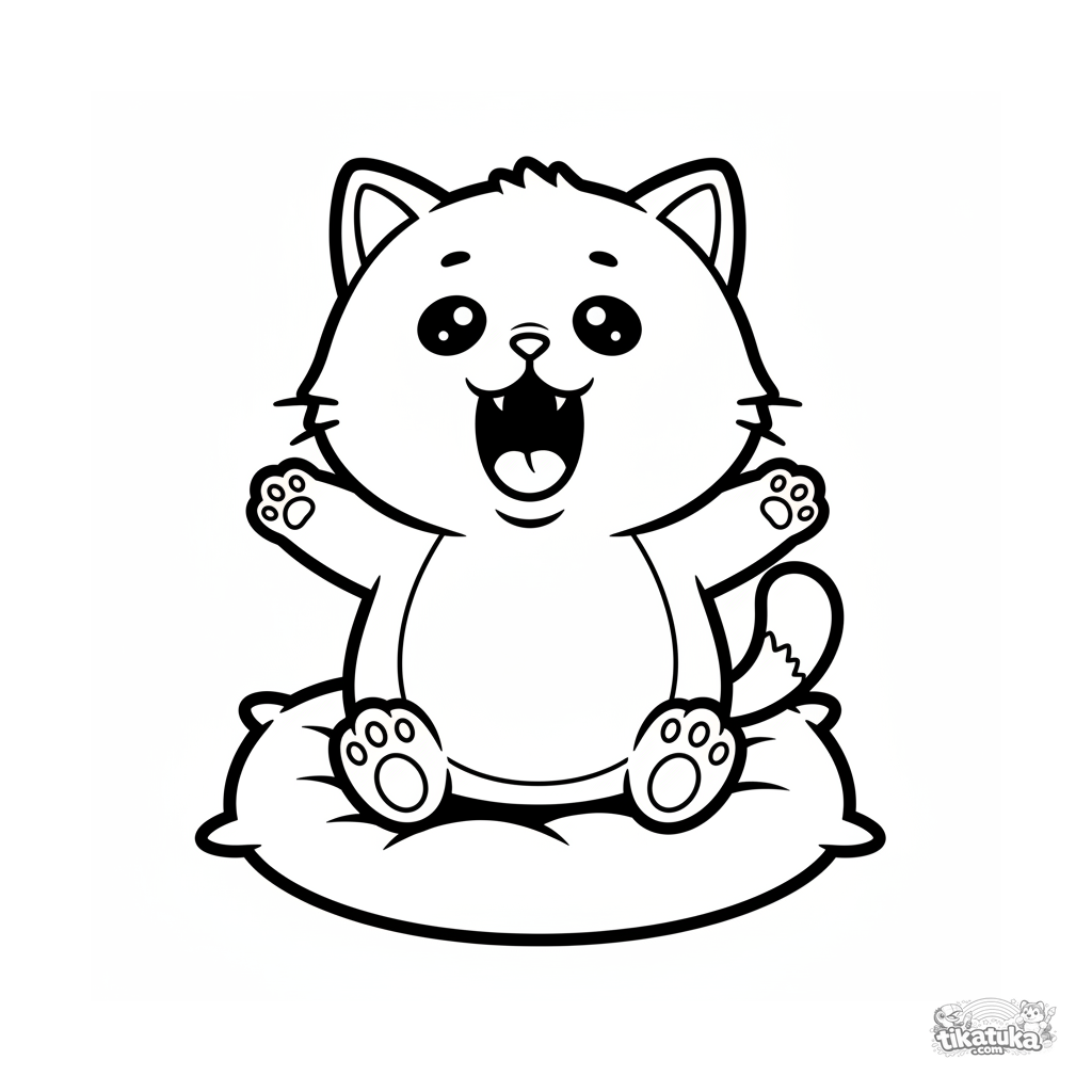Página para colorir estilo chibi para 2-3 anos: um gatinho bocejando sentado em um travesseiro. Cabeça enorme, linhas simples.