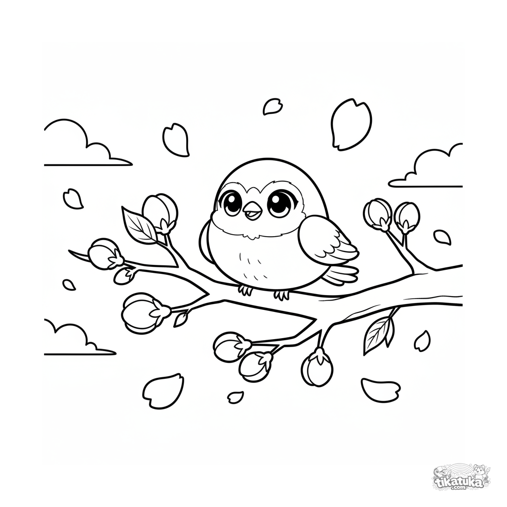 Página fofa para colorir de um ramo de cerejeira com um pássaro no estilo chibi para crianças de 4-6 anos. Pétalas caindo, pássaro com olhos grandes, clima de primavera.