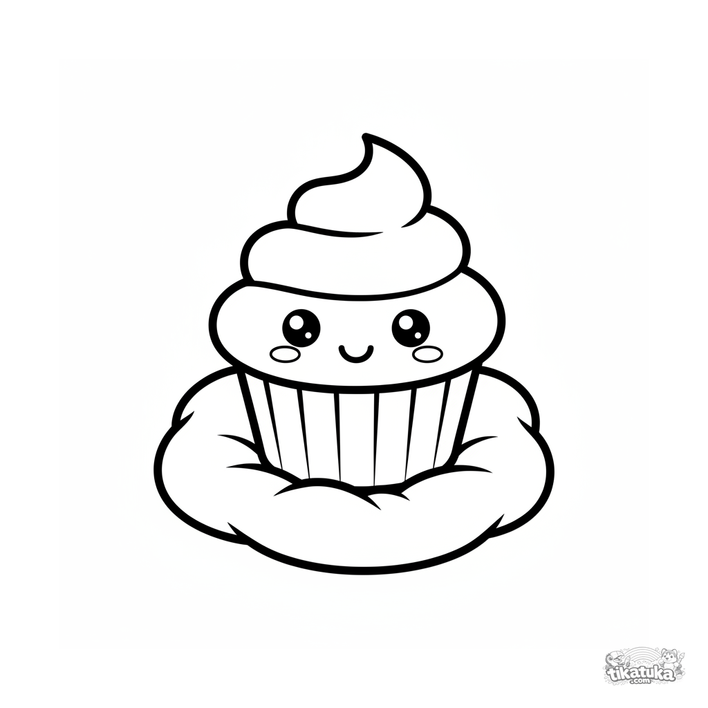 Página para colorir para bebês no estilo chibi: um cupcake sorridente com olhos de cereja senta em uma almofada. Formas arredondadas grandes, poucos detalhes.