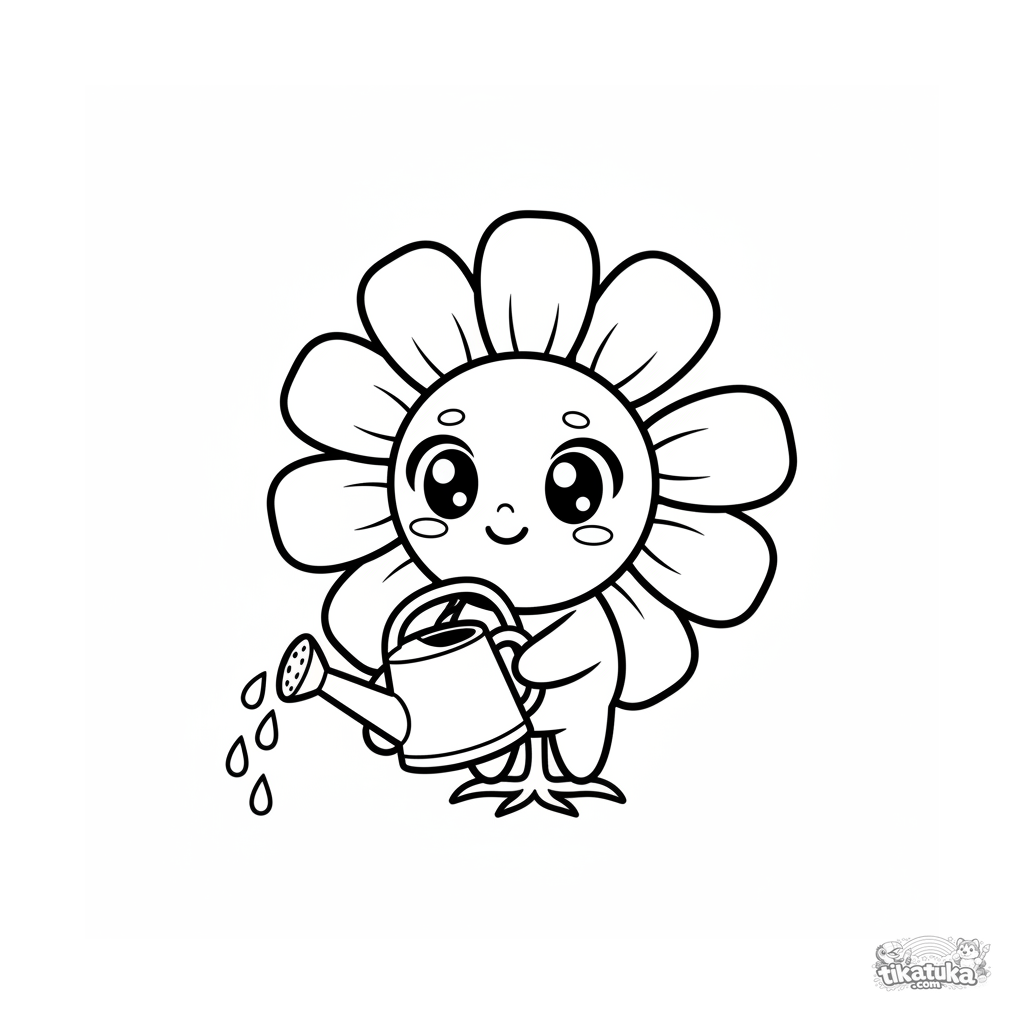 Página para colorir para crianças pequenas: uma margarida chibi engraçada com olhos enormes tenta se regar com um regador grande. Formas grandes e simples.