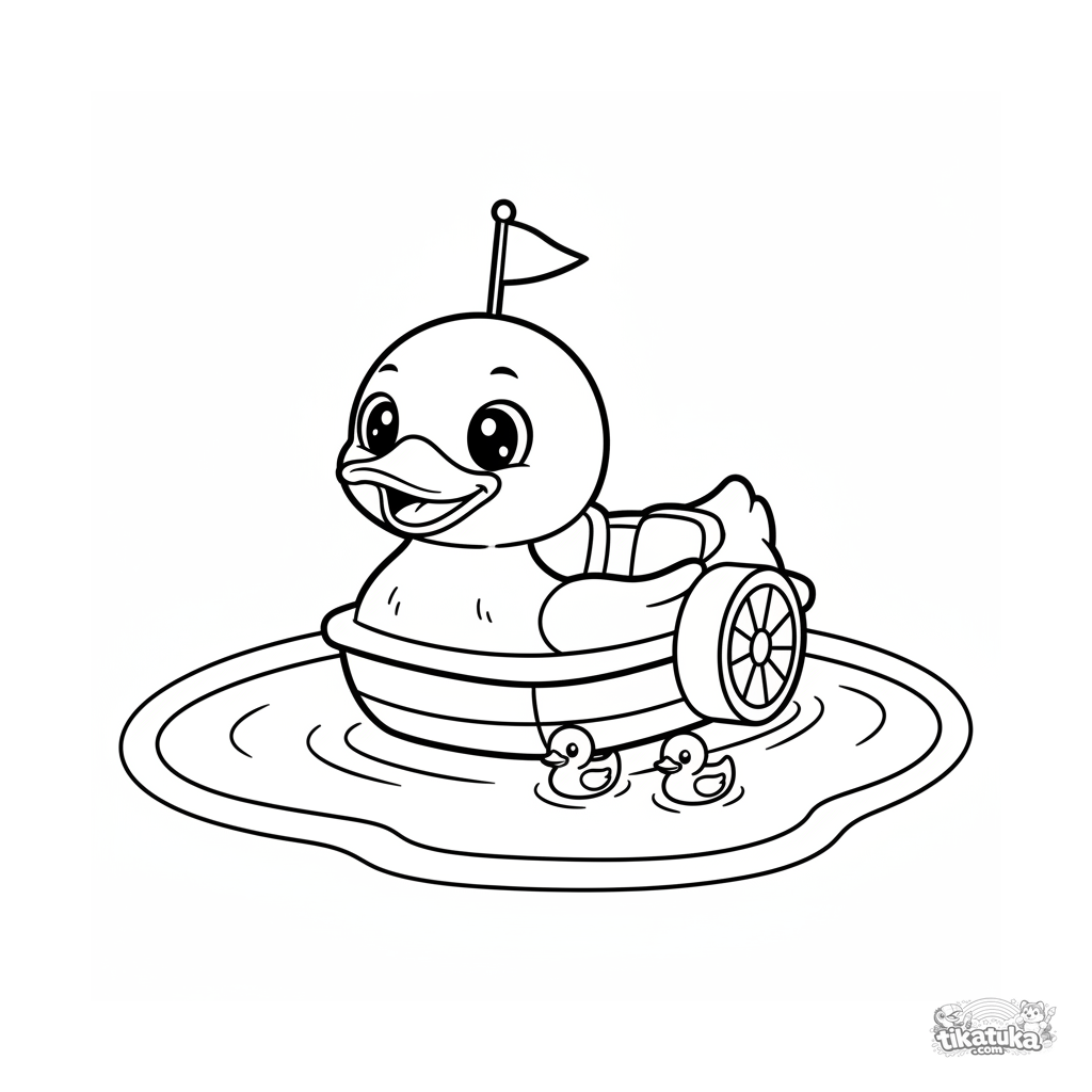 Página simples para colorir para crianças pequenas de 2 a 3 anos: um barco a pedal fofo em forma de pato no lago do parque.
