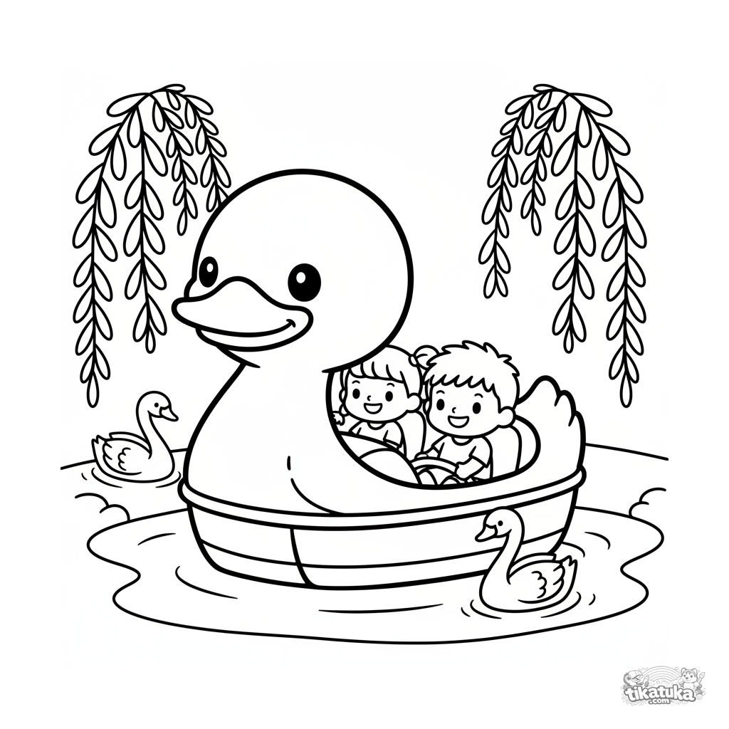 Página para colorir para crianças pequenas: um barco a pedal fofo em forma de patinho flutua em um lago de parque. Formas muito simples e grandes.