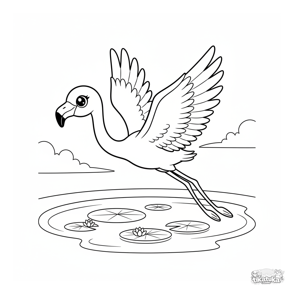 Página para colorir para crianças: um adorável flamingo estilo chibi voando sobre um lago ao pôr do sol. Cena cativante para idades de 5-8 anos.