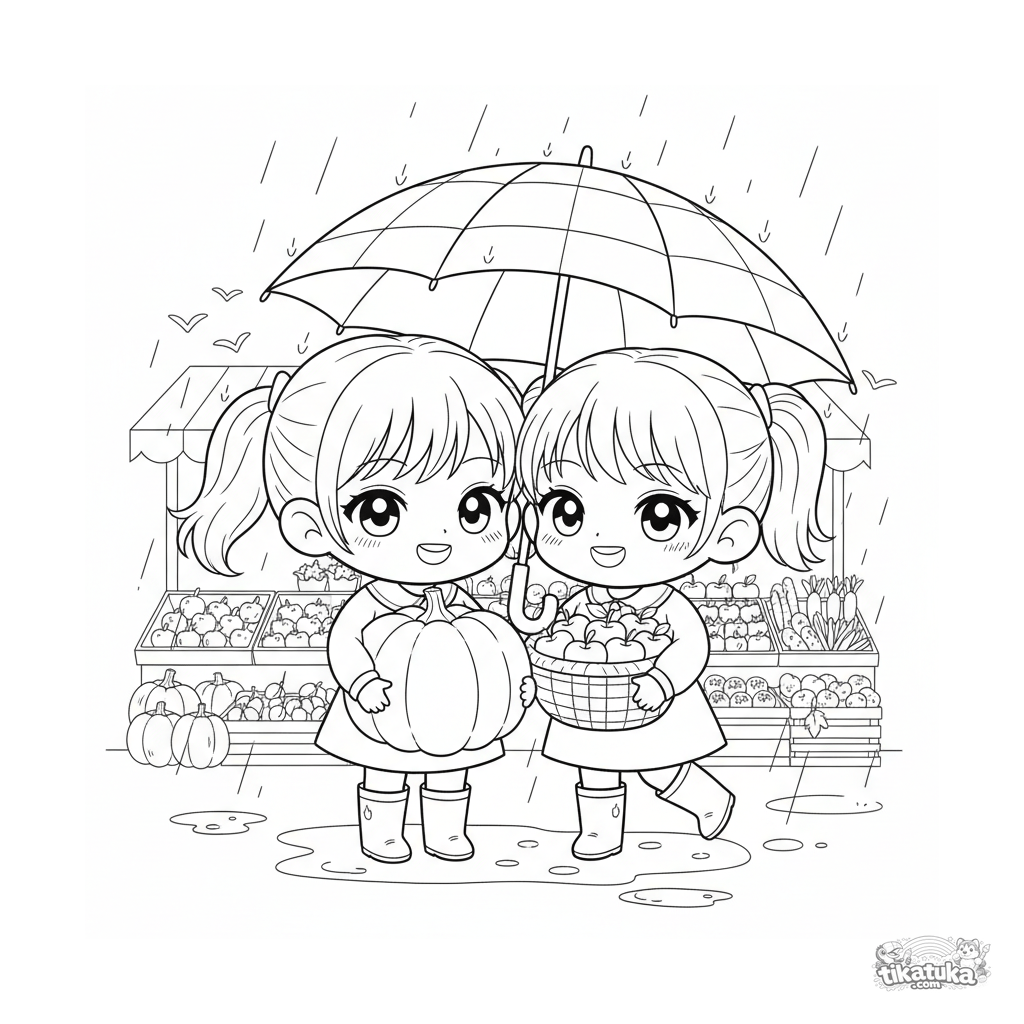 Página para colorir para crianças 7-9: dois amigos estilo chibi sob um grande guarda-chuva carregam uma abóbora e maçãs em uma feira de outono sob a chuva.