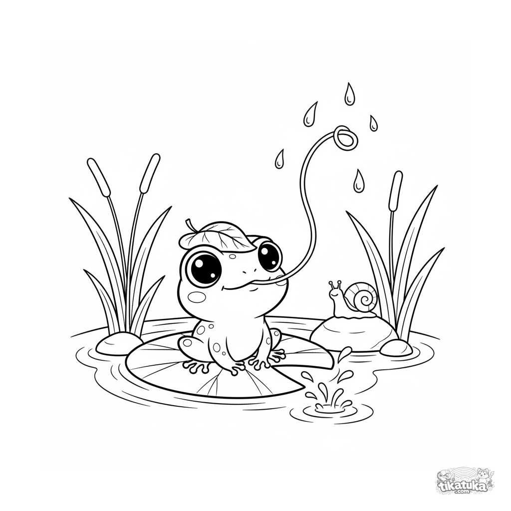 Página para colorir para crianças (4-6 anos) estilo chibi: um sapo fofo com chapéu de folha sentado em uma vitória-régia pegando gotas de chuva. Olhos expressivos, composição simples.