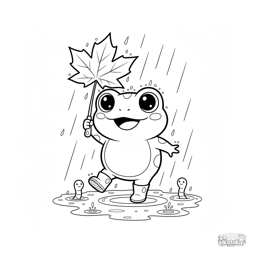 Página para colorir para crianças 4-6: um sapo fofo no estilo chibi com botinhas de borracha dança alegremente na chuva, usando uma grande folha de bordo como guarda-chuva. Formas simples, expressão adorável.
