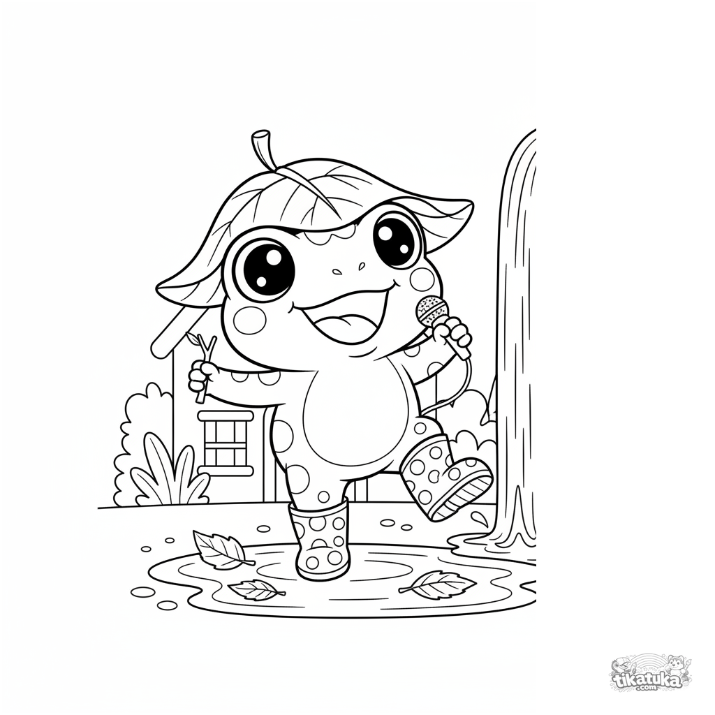 Página para colorir estilo chibi para crianças 4-6: um sapo com botas e chapéu de folha dança sob um fluxo de uma calha em um dia de outono.
