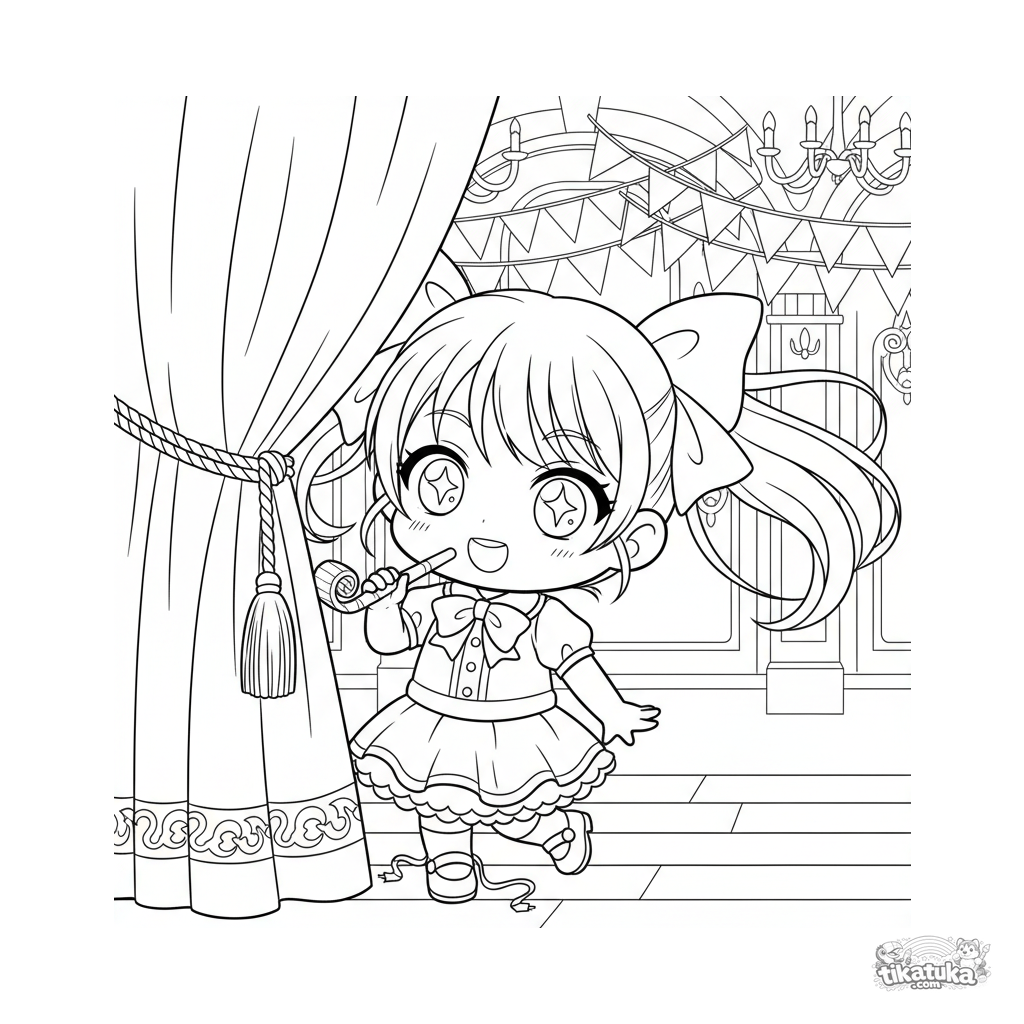 Página para colorir chibi para crianças 4-6: uma menina fofa com rabos de cavalo espiando atrás de uma cortina festiva. Cena de esconde-esconde.