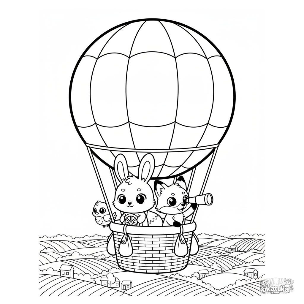 Página para colorir brilhante de um balão de ar quente em estilo fofo chibi com tripulação animal na cesta. Para crianças de 4 a 6 anos. Personagens alegres, formas claras.
