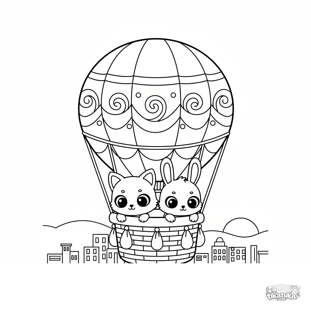 Página para colorir de um balão de ar quente fofo no estilo chibi flutuando sobre uma cidade. Para crianças de 4 a 6 anos. Formas simples, personagens amigáveis.