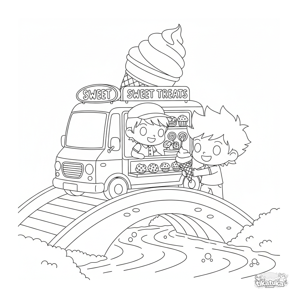 Página para colorir para crianças 4-6: um caminhão de sorvete chibi fofo numa ponte colorida sobre um rio. Um vendedor alegre atende um cliente.