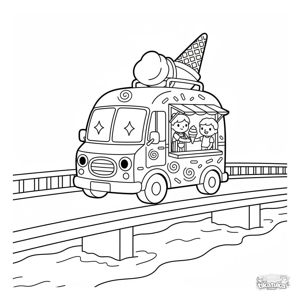 Página para colorir simples para crianças pequenas de 2-3 anos: um caminhão de sorvete fofo no estilo chibi estacionado em uma ponte sobre um rio. Formas grandes, contornos claros, margens amplas.