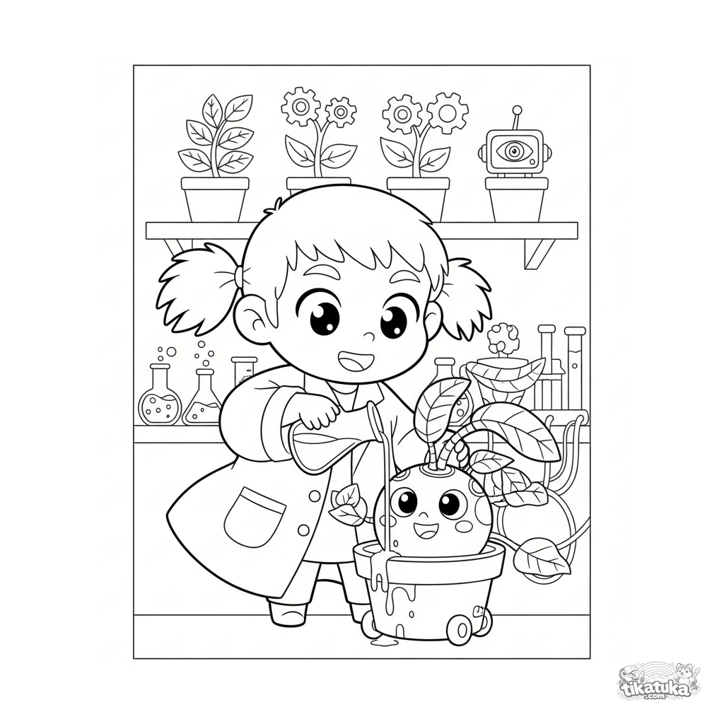 Página para colorir para crianças 4-6 no estilo chibi: um menino inventor em um laboratório alimentando um robô planta com líquido brilhante. Formas fofas e simples.