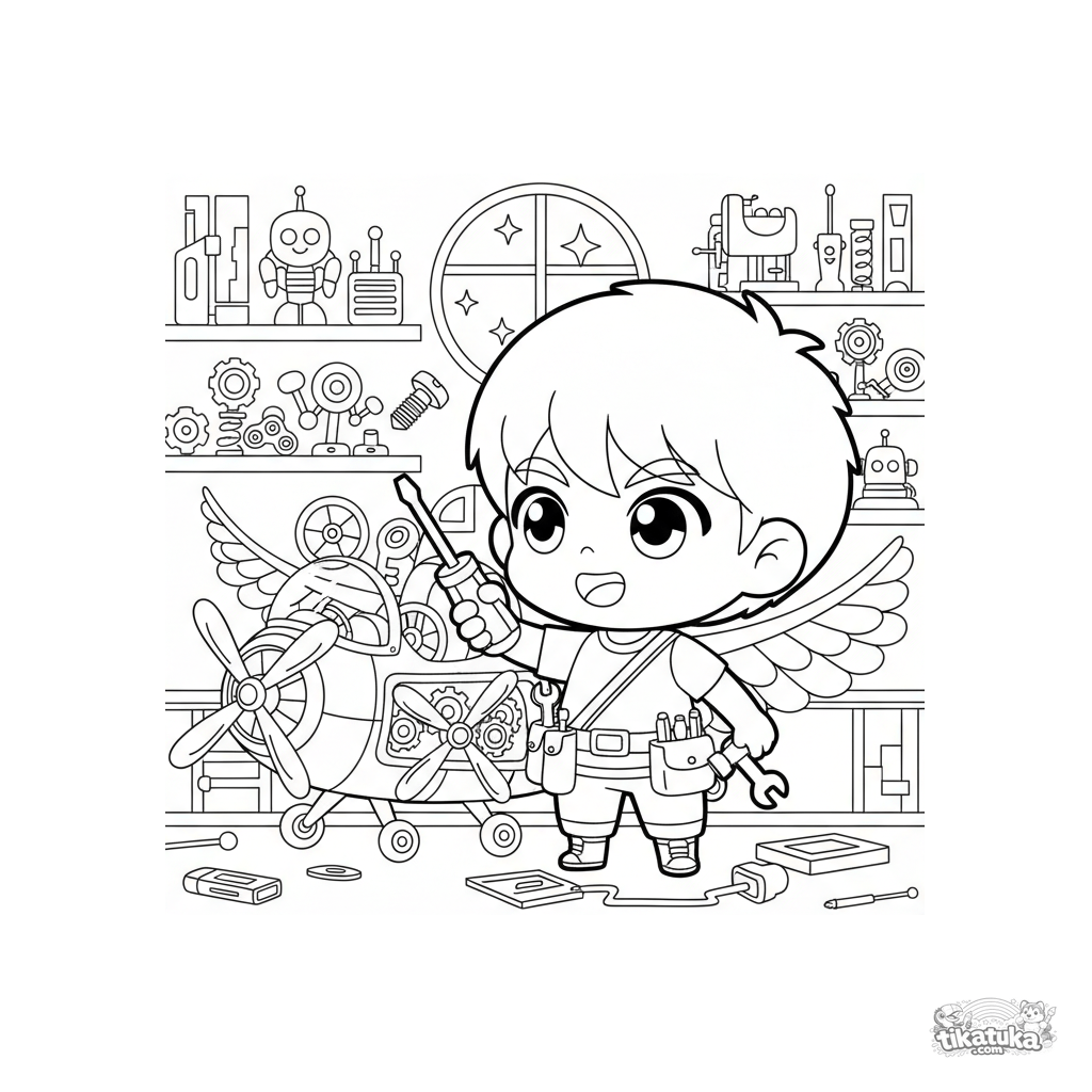 Página para colorir para crianças de 4-6 anos no estilo chibi: um inventor alegre conserta uma máquina voadora em seu laboratório secreto.