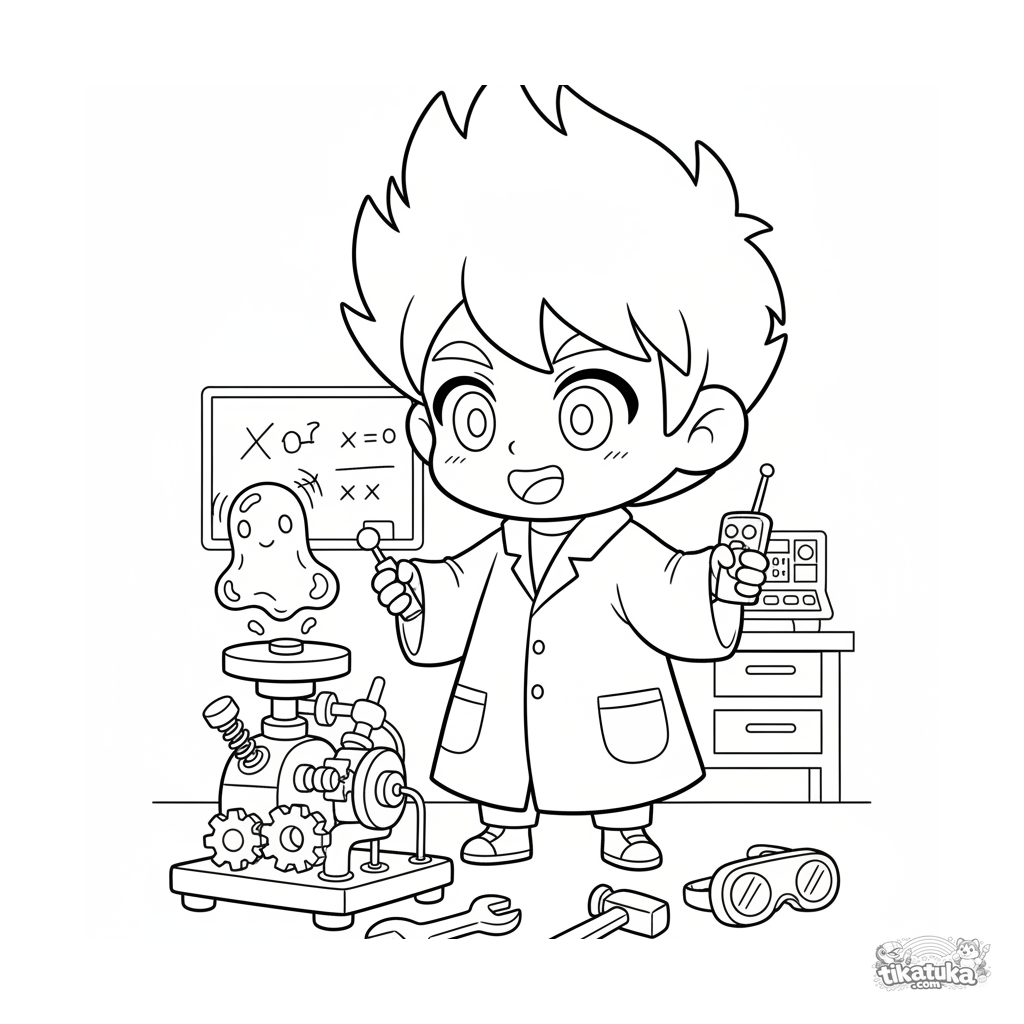 Página para colorir para crianças de 4-6 anos no estilo chibi: um inventor divertido em um laboratório secreto testa um lançador de gelatina. Cena brilhante e simples.