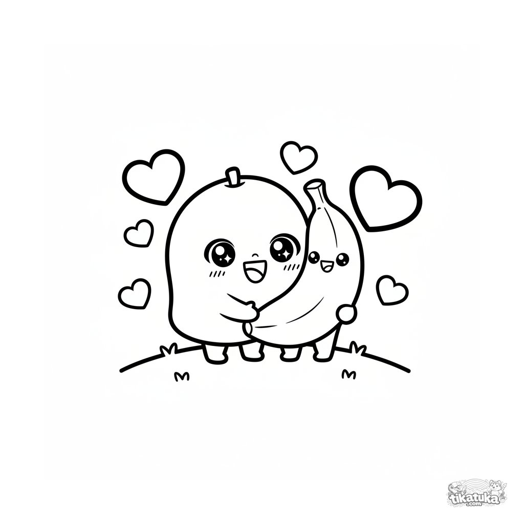 Página para colorir simples para crianças pequenas: frutas chibi fofas, manga e banana, se abraçando em um monte de grama. Formas grandes e simples, margens amplas, detalhe mínimo.