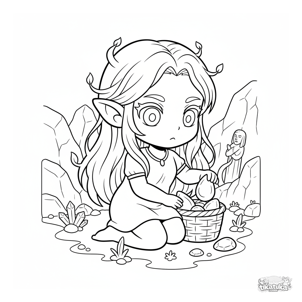 Página para colorir para crianças de 4-6 anos: uma fofa ninfa chibi colhe lágrimas de pedra mágicas no covil da Górgona. Olhos grandes e brilhantes, formas simples.