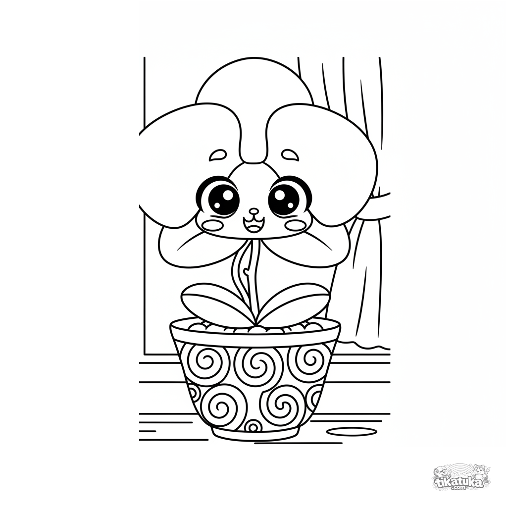 Página para colorir para crianças 4-6: uma orquídea chibi fofa em um vaso elegante no parapeito da janela. A flor tem expressão engraçada.