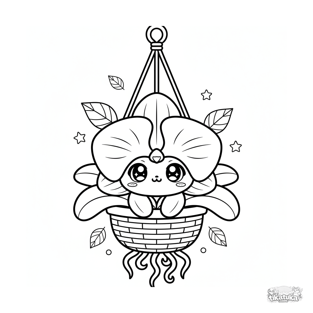 Página para colorir para crianças 4-6: uma orquídea fofa no estilo chibi crescendo em um cesto suspenso. Rosto engraçado, formas simples.