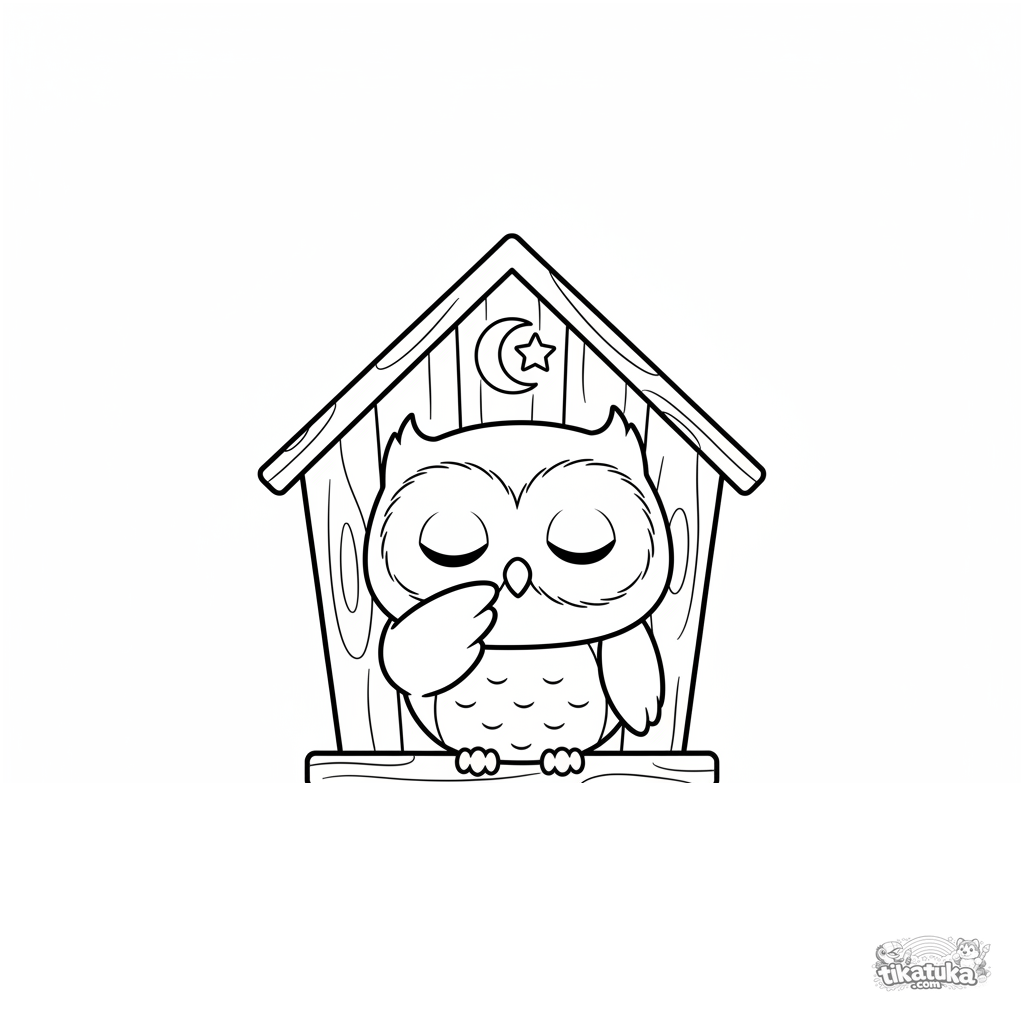 Página simples para colorir para crianças pequenas 2-3: uma adorável corujinha dormindo profundamente em uma aconchegante casa de pássaros de madeira. Formas grandes e simples.