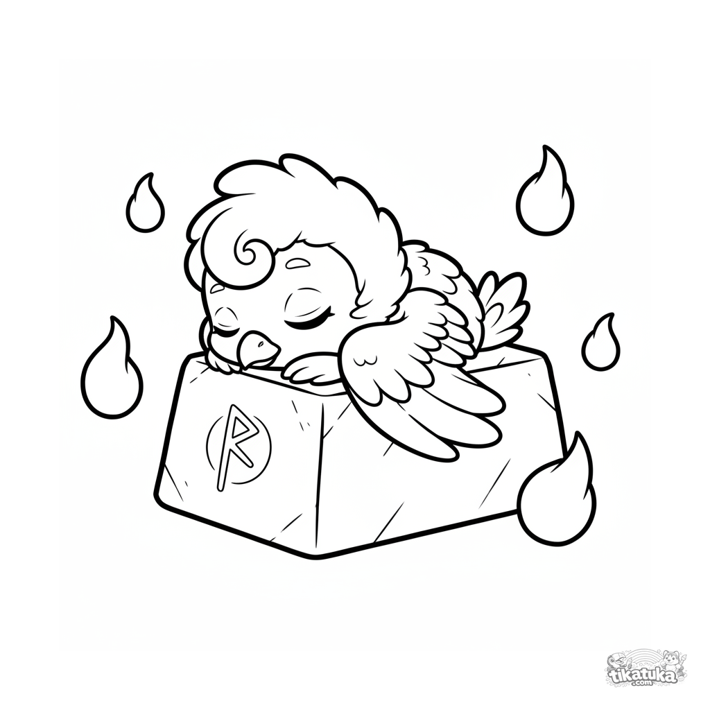 Página simples para colorir para bebês de 2-3 anos: uma fênix chibi dorme placidamente em uma pedra rúnica. Formas grandes e simples, perfeitas para primeiros lápis.