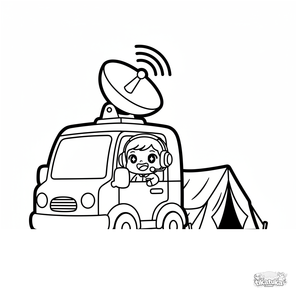 Página para colorir simples para crianças pequenas de 2-3 anos: um caminhão de rádio fofo com uma grande antena e um soldado sorridente na janela perto da barraca de comando.