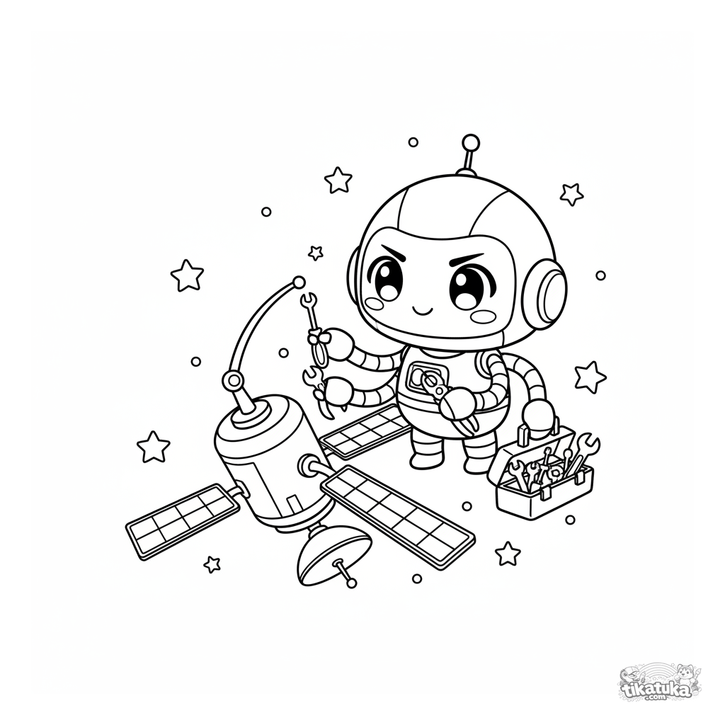 Página para colorir para 4-6 anos: um robô fofo estilo chibi conserta a antena de um satélite no espaço sideral entre as estrelas.