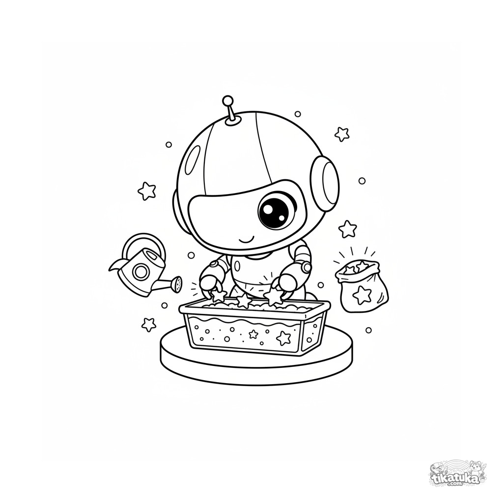 Página para colorir para 7-9 anos: um robô chibi fofo planta sementes mágicas de luz estelar em uma pequena plataforma no espaço sideral. Cena cósmica doce e suave para colorir.