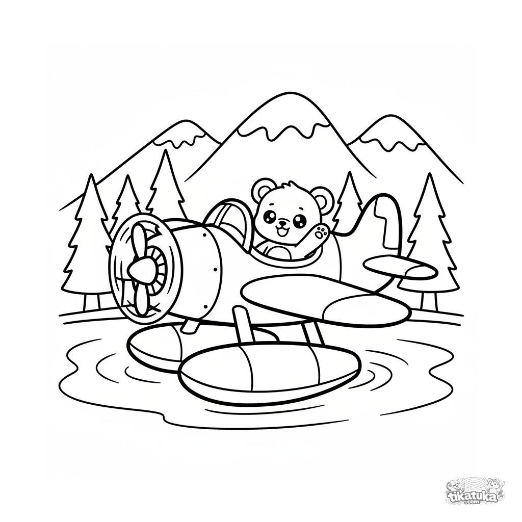 Página simples para colorir para crianças de 2-3 anos: um hidroavião fofo no estilo chibi decolando de um lago de montanha. Formas grandes, contornos grossos, poucos detalhes.