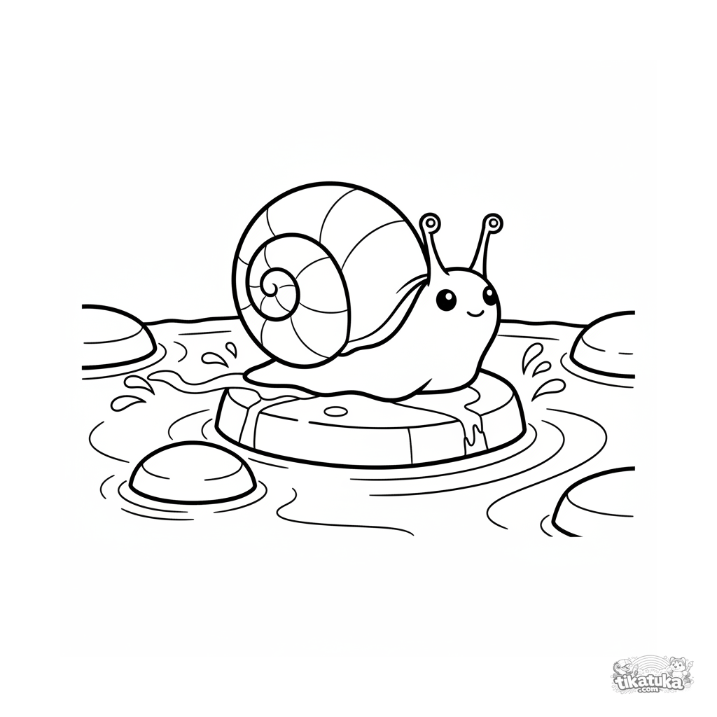 Página para colorir para crianças 4-6 no estilo chibi: um caracol fofo com uma concha grande cruza cuidadosamente o riacho numa pedra.