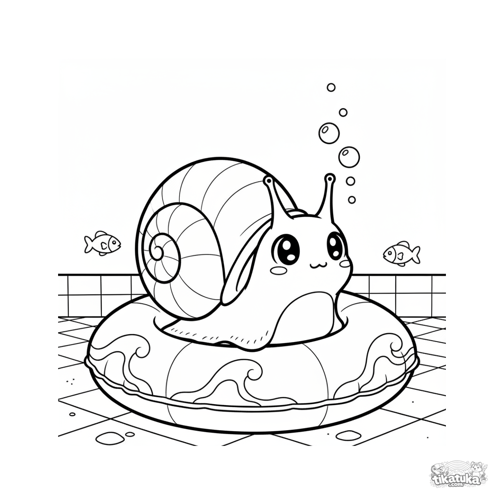 Página para colorir para crianças de 4-6 anos: um caracol fofo no estilo chibi espreita pela válvula de um anel inflável no fundo da piscina.