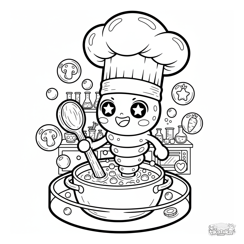 Página para colorir: um micróbio espiral feliz com chapéu de chef cozinha sopa em uma placa de petri. Estilo chibi, olhos estrelados, para 4-6 anos.