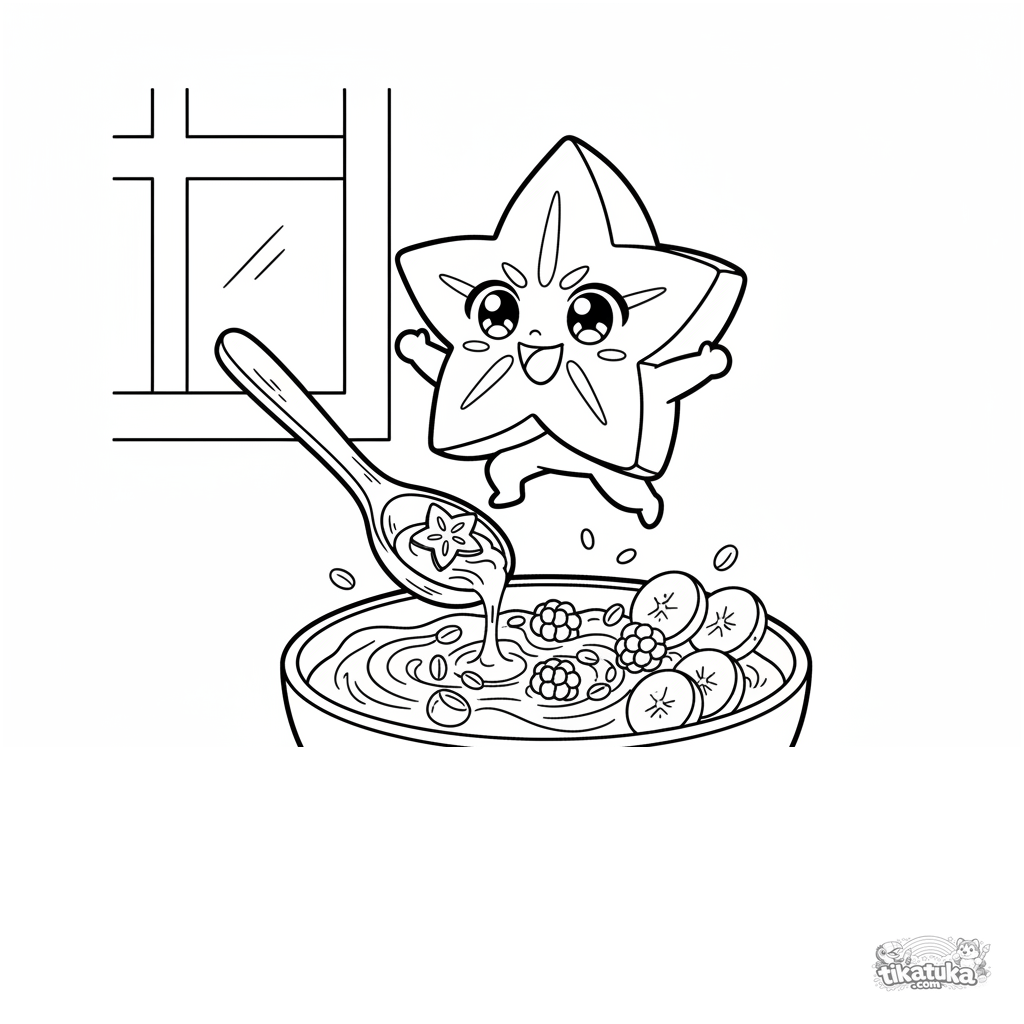 Página para colorir para crianças 7-9: uma fatia de carambola chibi pula em uma tigela de smoothie. Cena dinâmica de café da manhã com detalhes.