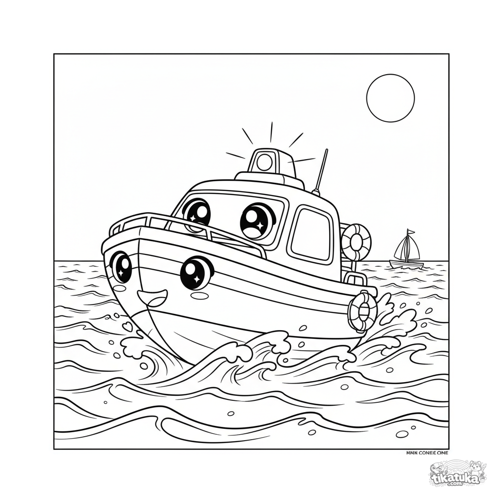 Página para colorir para crianças 4-6: uma lancha de resgate estilo chibi corre para ajudar um barco à vela. Olhos grandes, ondas.