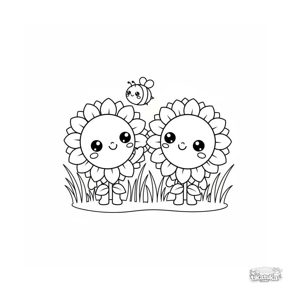 Página para colorir para crianças 4-6: girassóis fofos no estilo chibi em um campo com uma abelha. Proporções engraçadas, detalhes simples, cena amigável.