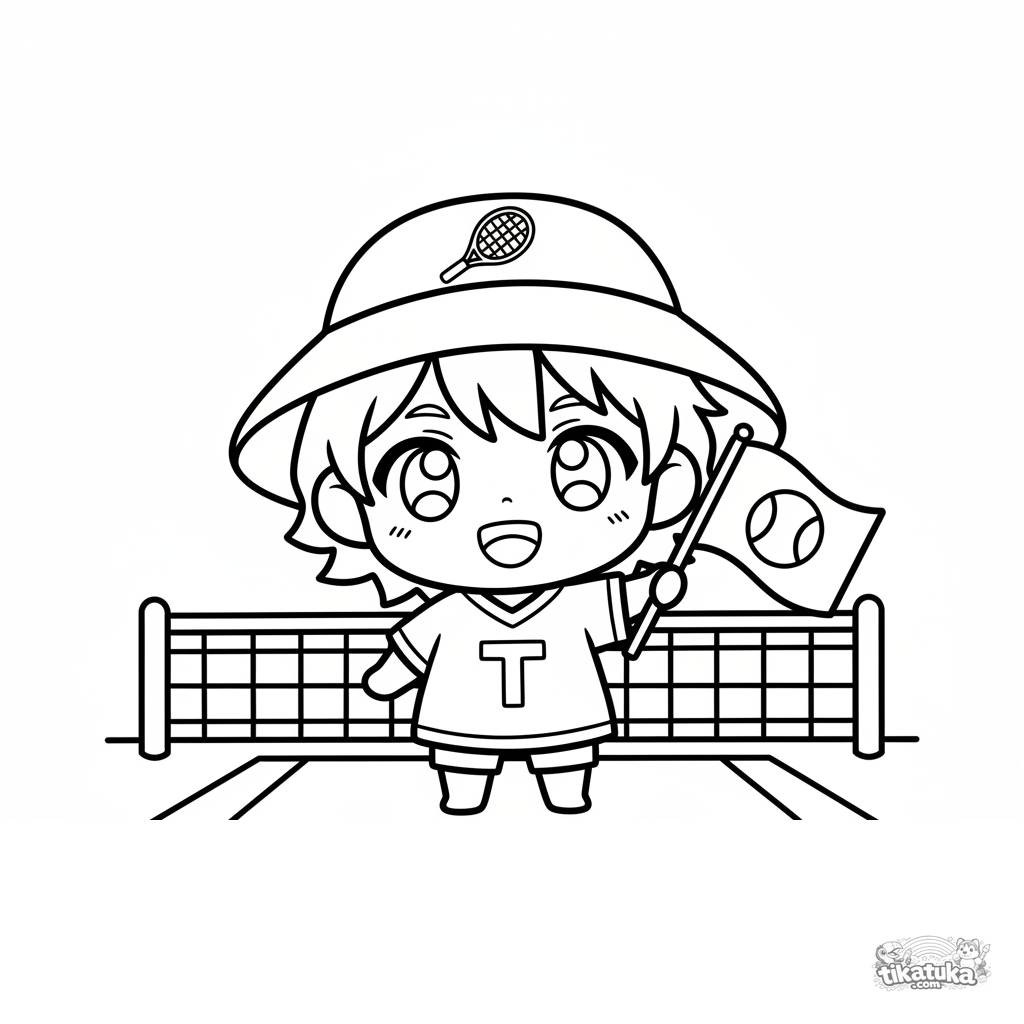 Página simples para crianças pequenas 2-3: um fã chibi fofo acenando bandeira em uma quadra de tênis. Cabeça enorme, formas simples.