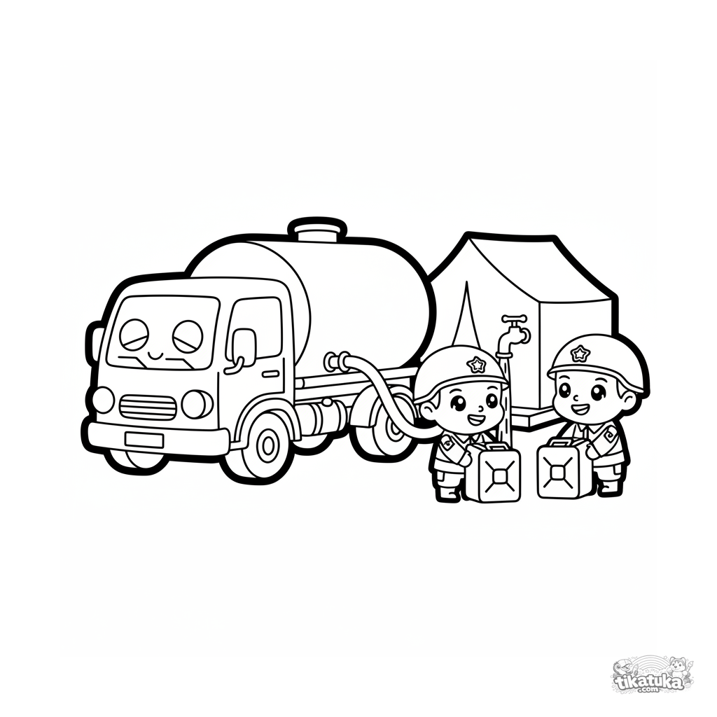 Página para colorir para crianças pequenas de 2-3 anos: um caminhão pipa chibi fofo distribuindo água nas barracas. Formas muito simples e grandes para colorir pela primeira vez.
