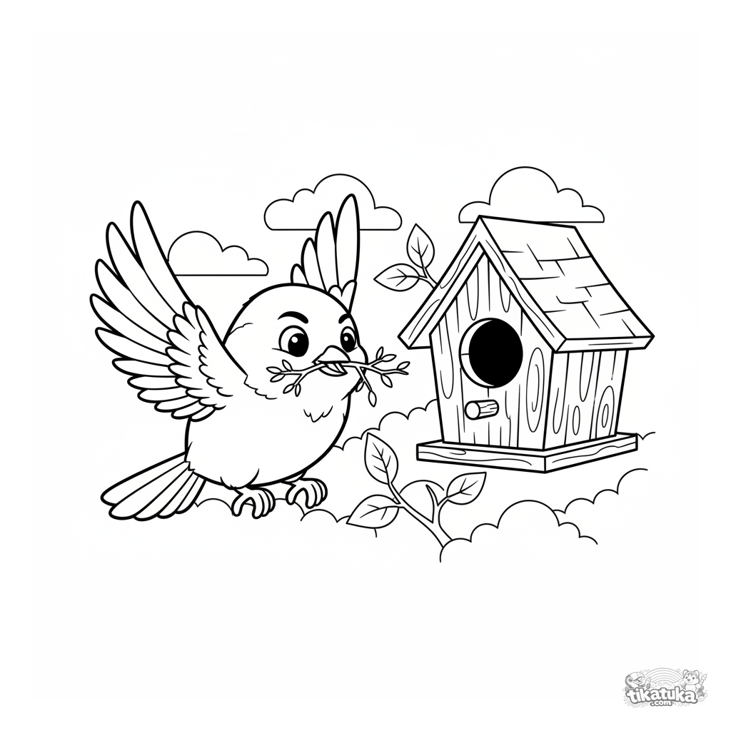 Página para colorir para 7-9 anos: um chapim voando para uma casa de pássaros com gravetos para seu ninho. Cena dinâmica de construção.