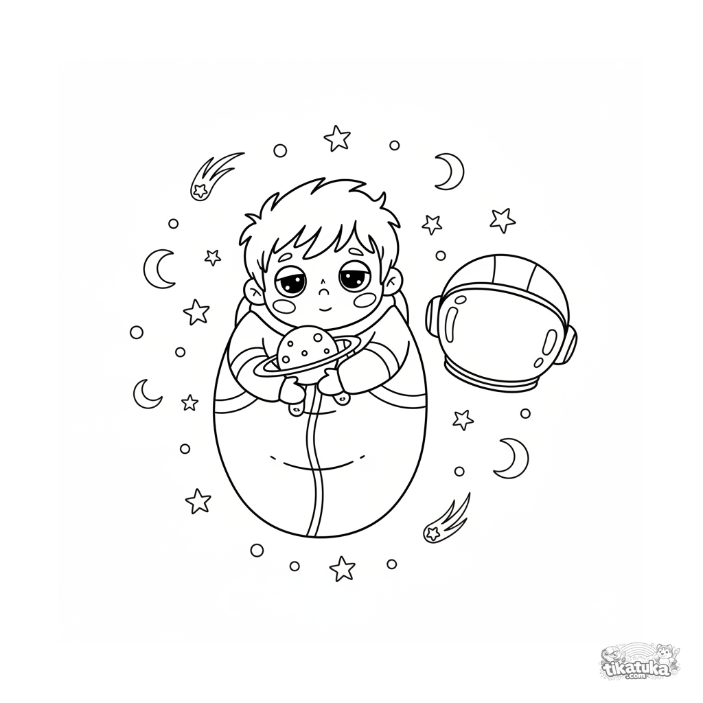 Página para colorir para crianças 4-6: uma criança astronauta dorme em um saco de dormir aconchegante flutuando entre estrelas no espaço sideral. Cena fofa e calma.