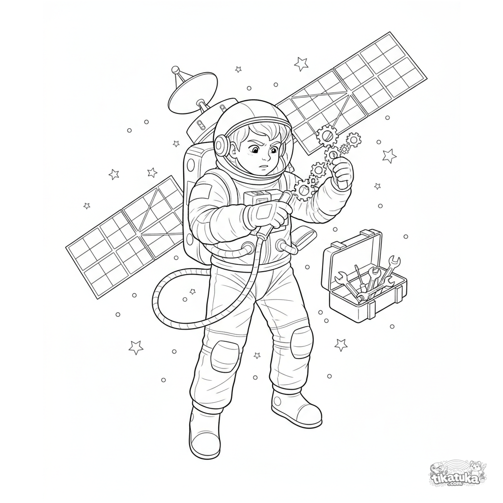 Página para colorir detalhada para 10-12 anos: uma criança astronauta conserta um satélite no espaço sideral, com ferramentas e estrelas flutuando.