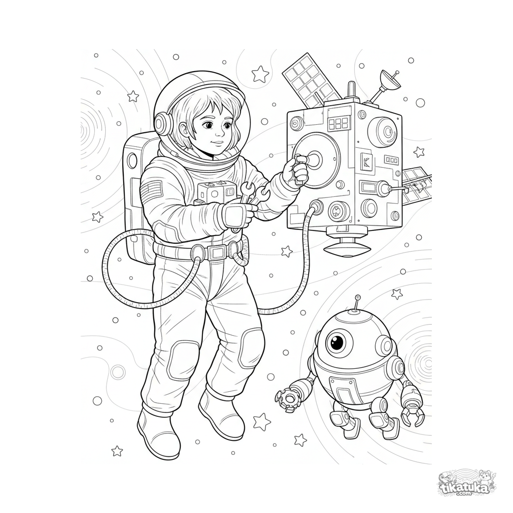 Página para colorir para crianças maiores 10-12: uma criança astronauta repara um satélite no espaço, ajudada por um robô, com estrelas ao fundo.