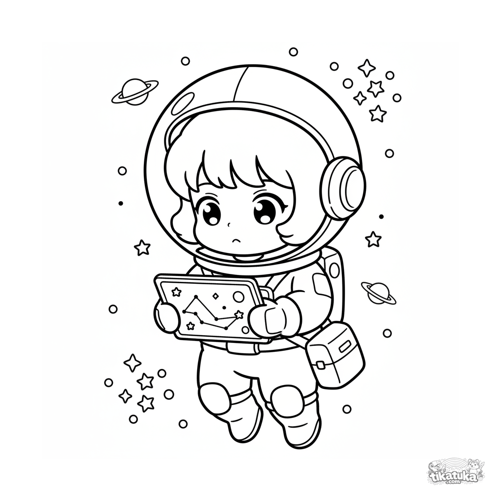 Página para colorir para crianças de 7-9 anos: um jovem explorador no espaço sideral mapeia as estrellas.