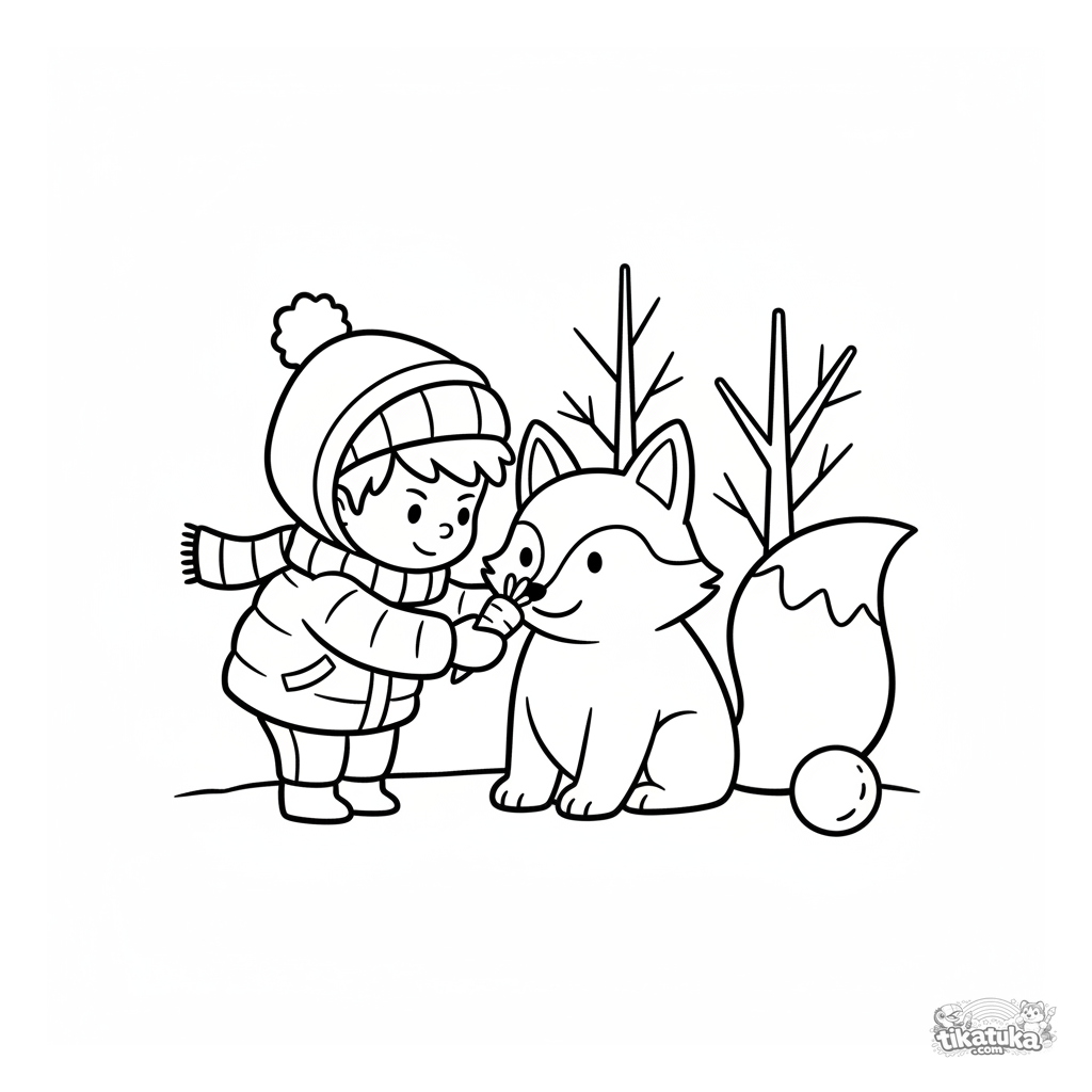 Página de inverno para colorir para crianças: uma criança agasalhada construindo uma escultura de raposa de neve e colocando uma cenoura como nariz.