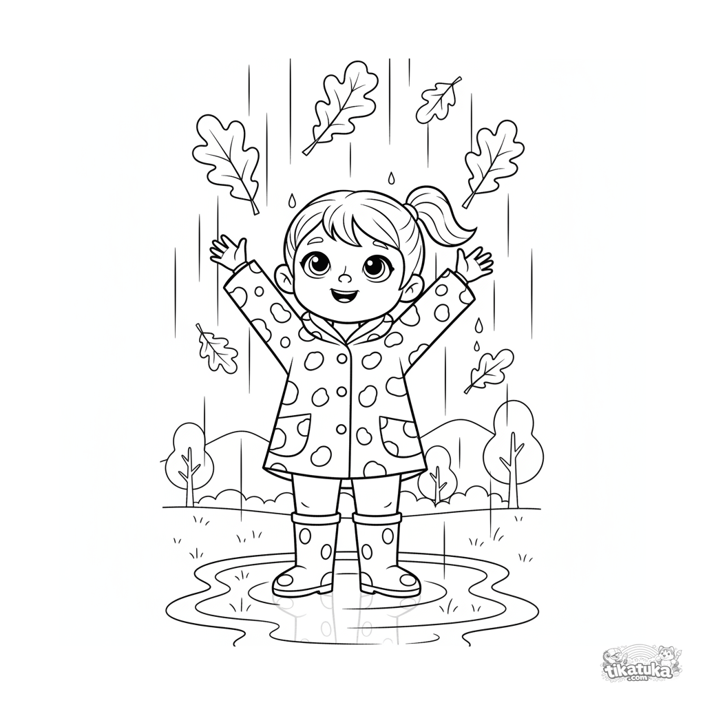 Página para colorir para crianças de 4-6 anos: uma criança de capadechuva e botas pega folhas de outono caindo na chuva. Detalhe moderado, formas claras.